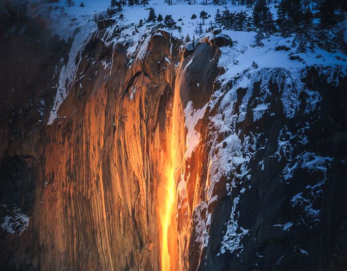 How to safely hike to the Yosemite Firefall viewing spots in the snow.